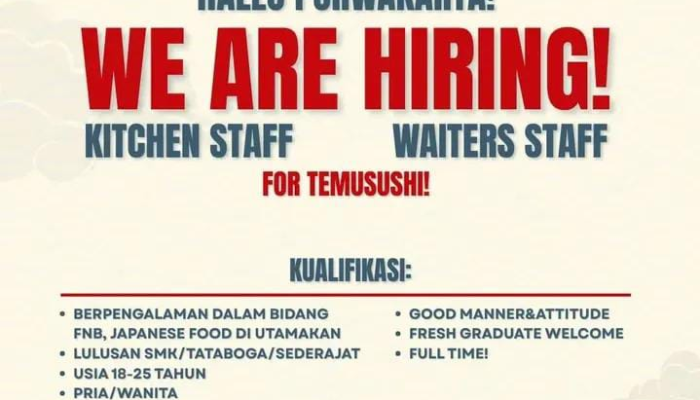 Halo warga Purwakarta! Apakah kamu memiliki minat besar di industri Food & Beverage (F&B), khususnya masakan Jepang? Temusushi, destinasi kuliner sushi favorit di Purwakarta, kini kembali membuka kesempatan karir bagi kamu yang enerjik dan berdedikasi untuk bergabung sebagai Kitchen Staff dan Waiters Staff.