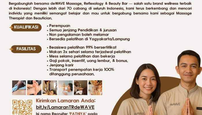 Apakah Anda sedang mencari peluang karir di industri wellness dan kecantikan? deWAVE Massage, Reflexology & Beauty Bar, salah satu brand wellness terbaik di Indonesia, sedang membuka lowongan kerja besar-besaran untuk posisi Massage Therapist. Dengan lebih dari 70 cabang yang tersebar di seluruh Indonesia, kami mengundang Anda yang memiliki semangat belajar tinggi untuk bergabung dan berkembang bersama kami.
