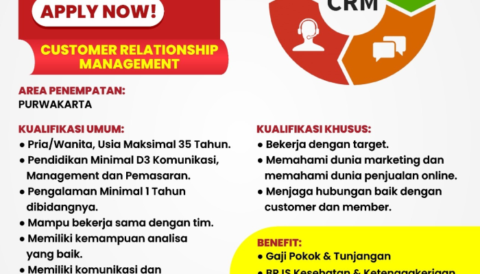 CRMPria/Wanita, Analisa Baik, Loyalitas, Komunikasi Interpersonal Baik35 TahunMinimal D3 Komunikasi/Manajemen/Pemasaran1 Tahun di Bidang yang Sama