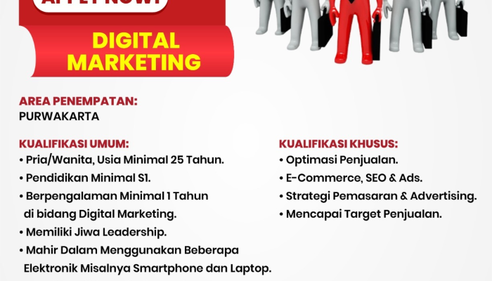 Digital MarketingPria/Wanita, Leadership, Mahir Elektronik (Smartphone/Laptop), Domisili disukaiMin. 25 TahunMinimal S11 Tahun di Bidang Digital Marketing