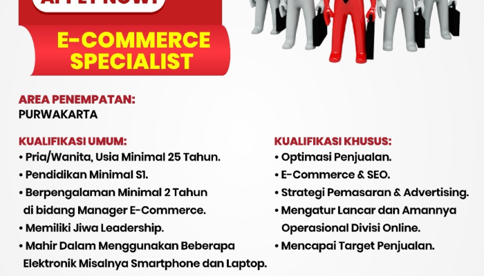 E-Commerce SpecialistPria/Wanita, Leadership, Mahir Elektronik (Smartphone/Laptop), Domisili disukaiMin. 25 TahunMinimal S12 Tahun di Bidang Manager E-Commerce