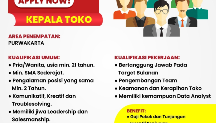 Kepala TokoPria/Wanita, Komunikatif, LeadershipSalesmanshipTroubleshootingMin. 21 TahunSMA Sederajat2 Tahun di Posisi yang Sama