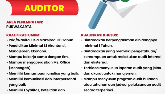 AuditorPria/Wanita, Loyalitas, Teliti, Bekerja Sama Tim, Kuasai Ms. Office30 TahunMinimal S1 Akuntansi/Manajemen/EkonomiDiutamakan 1 Tahun