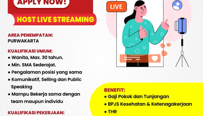 Host Live Streaming (Wanita)Wanita, Komunikatif, SellingPublic Speaking30 TahunSMA SederajatPengalaman Posisi yang Sama