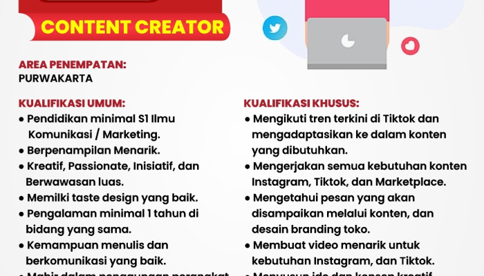 Content CreatorBerpenampilan Menarik, Kreatif, Taste Design Baik, Mahir Perangkat DigitalMinimal S1 Komunikasi/Marketing1 Tahun di Bidang yang Sama