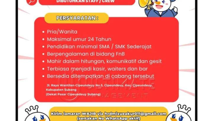 - Penempatan: Bersedia ditempatkan langsung di cabang Mixue Cipeundeuy Subang.
