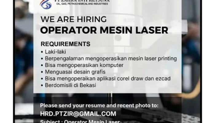 PT Zahra Inti Retsuna saat ini membuka kesempatan bagi para profesional yang berpengalaman untuk bergabung sebagai Operator Mesin Laser. Jika Anda memiliki kemampuan dalam pengoperasian mesin laser, desain grafis, serta mahir menggunakan software pendukung, ini adalah peluang karir yang tepat untuk Anda.