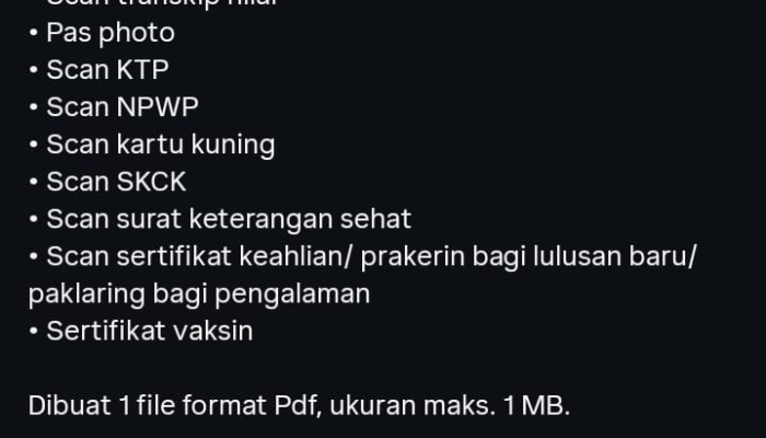 Penting: Semua dokumen di atas harus digabungkan menjadi satu file PDF dengan ukuran maksimal 1 MB.