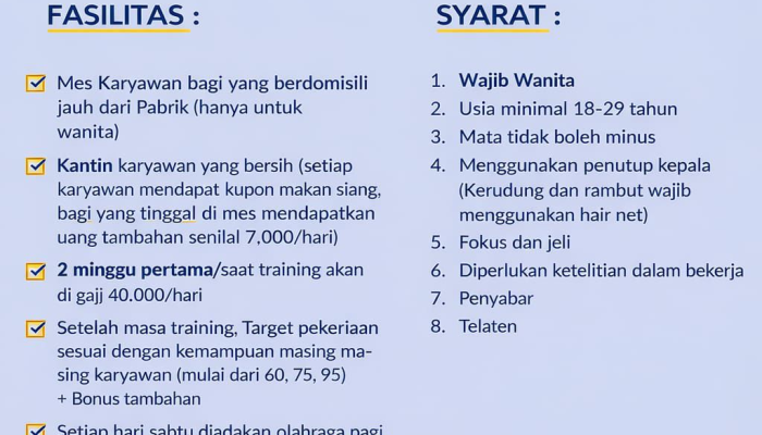 Jangan lewatkan kesempatan untuk berkarir di perusahaan yang memperhatikan kesejahteraan karyawannya. Simak rincian lengkap mengenai kualifikasi, fasilitas, dan cara melamar di bawah ini.