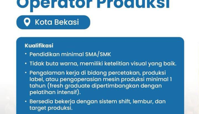 • Diutamakan memiliki pengalaman kerja di bidang percetakan, produksi label, atau pengoperasian mesin produksi minimal 1 tahun.
