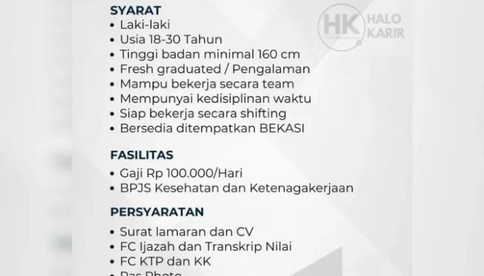 • Penempatan: Bersedia ditempatkan di BEKASI.