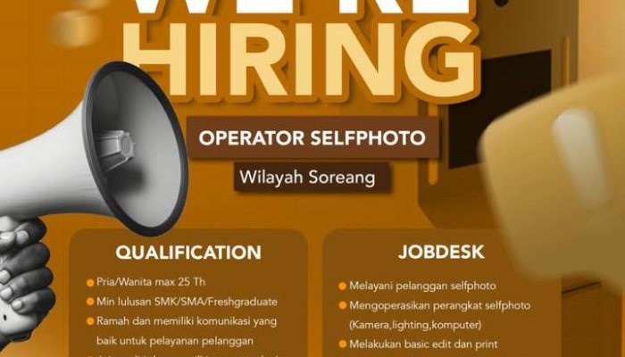Apakah Anda pribadi yang ceria, menyukai dunia fotografi, dan berdomisili di wilayah Soreang? Ruang Visual Selfphoto sedang mencari talenta muda yang bersemangat untuk bergabung sebagai bagian dari tim operasional kami! Ini adalah kesempatan yang tepat bagi Anda yang ingin bekerja di lingkungan kreatif yang menyenangkan dan membantu pelanggan mengabadikan momen berharga mereka.