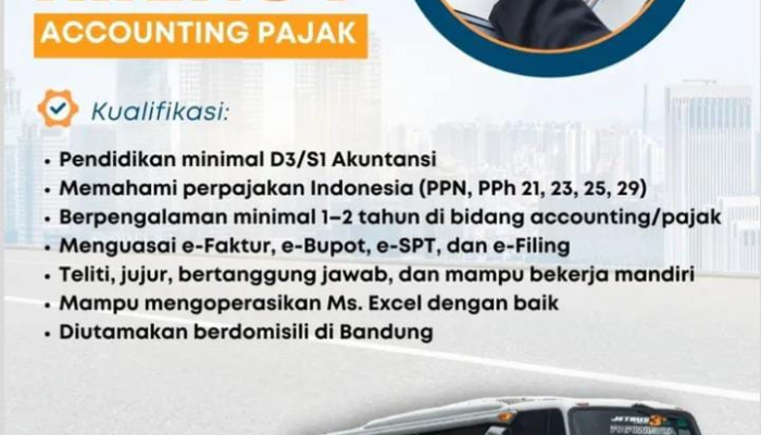 Loker Accounting Pajak Bandung — Apakah Anda seorang profesional di bidang akuntansi yang memahami seluk-beluk perpajakan di Indonesia? Pakar Wisata, perusahaan penyedia layanan perjalanan dan transportasi terkemuka, sedang membuka kesempatan karir bagi Anda untuk bergabung sebagai Accounting Pajak. Kami mencari individu yang teliti, jujur, dan mampu bekerja mandiri untuk mengelola administrasi keuangan dan perpajakan perusahaan kami di Bandung.