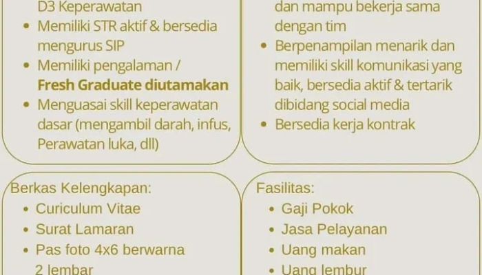 Apakah Anda seorang perawat wanita yang tertarik dengan dunia kecantikan dan estetika? Sebuah klinik/pusat kecantikan di Purwakarta membuka kesempatan bagi Anda untuk bergabung sebagai Perawat Estetika. Dengan gaji pokok, tunjangan, hingga fasilitas treatment gratis, ini adalah peluang karir yang sangat menjanjikan!