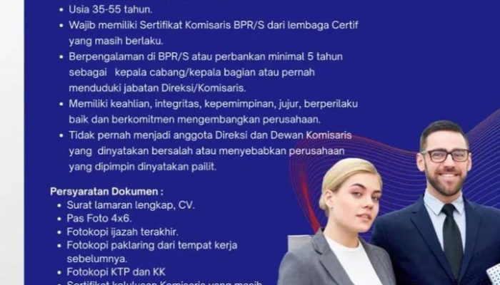 - Berpengalaman di BPR/S atau perbankan minimal 5 tahun sebagai Kepala Cabang/Bagian atau pernah menduduki jabatan Direksi.
