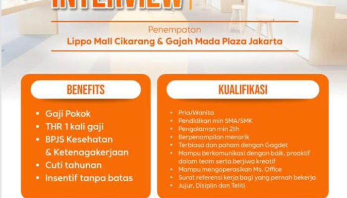 Apakah Anda familiar dengan dunia gadget Xiaomi dan memiliki passion di bidang penjualan dan pelayanan pelanggan? Authorized Mi Store (Xiaomi) sedang mencari individu proaktif untuk bergabung sebagai Product Consultant (PC). Ini adalah kesempatan emas untuk berkarir di brand teknologi global dengan penempatan di Lippo Mall Cikarang & Gajah Mada Plaza Jakarta. Dapatkan gaji pokok, THR, BPJS, dan insentif tanpa batas! Segera persiapkan diri Anda untuk acara Walk In Interview yang akan datang!