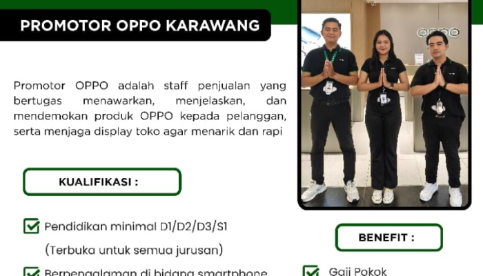 Apakah Anda memiliki minat besar di dunia teknologi dan senang berinteraksi dengan orang baru? OPPO Indonesia sedang membuka kesempatan karir menarik bagi Anda untuk bergabung sebagai Promotor OPPO Karawang. Kami mencari talenta muda yang kreatif, komunikatif, dan bersemangat untuk menjadi wajah dari produk-produk inovatif OPPO kepada pelanggan di wilayah Karawang. Jadilah bagian dari tim penjualan kami dan raih berbagai benefit profesional yang kompetitif!.