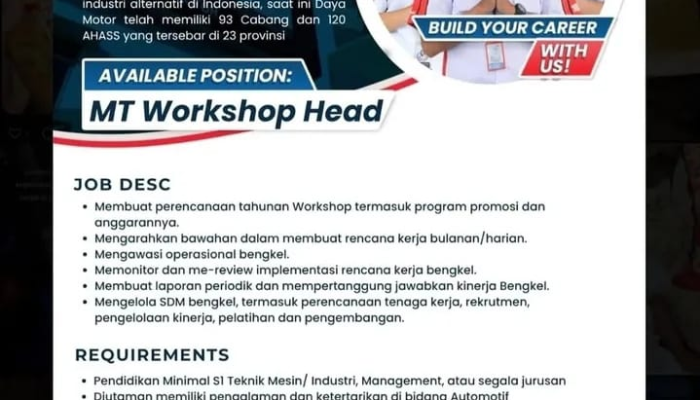 Perusahaan sedang membuka kesempatan karier bagi talenta terbaik untuk posisi MT Workshop Head.