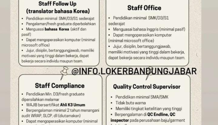 Jangan lewatkan kesempatan untuk membangun karir yang stabil dan menjanjikan di salah satu perusahaan garmen terkemuka di wilayah Bandung Barat. Simak detail posisi, persyaratan, dan cara melamarnya di bawah ini!