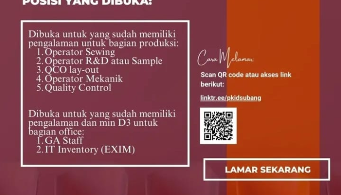 Apakah Anda seorang profesional di bidang produksi atau administrasi kantor yang sedang mencari tantangan baru? PT Pungkook Indonesia One mengundang Anda untuk bergabung dengan tim kami. Kami membuka berbagai posisi baik untuk bagian produksi maupun kantor. Jika Anda memiliki pengalaman dan kualifikasi yang kami butuhkan, segera ambil kesempatan ini dan berkembang bersama perusahaan manufaktur tas dan barang kulit yang terkemuka!