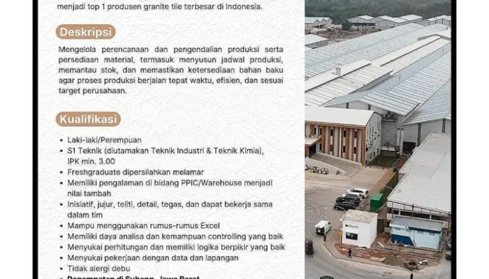 - Pengalaman: Memiliki pengalaman di bidang PPIC/Warehouse akan menjadi nilai tambah, namun lulusan baru (fresh graduate) dipersilakan melamar.