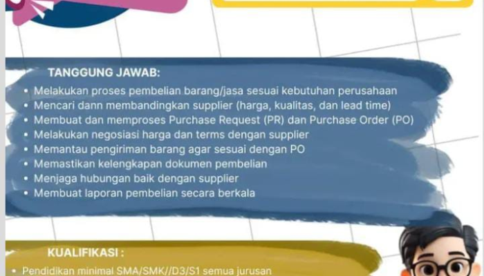 - Pengalaman: Memiliki pengalaman sebagai Purchasing / Procurement Staff atau program magang (internship) di bidang terkait.