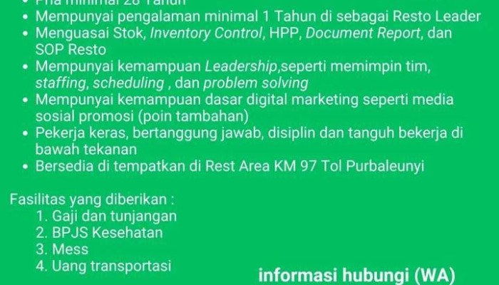 - Pengalaman: Memiliki pengalaman kerja minimal 1 tahun sebagai Resto Leader.
