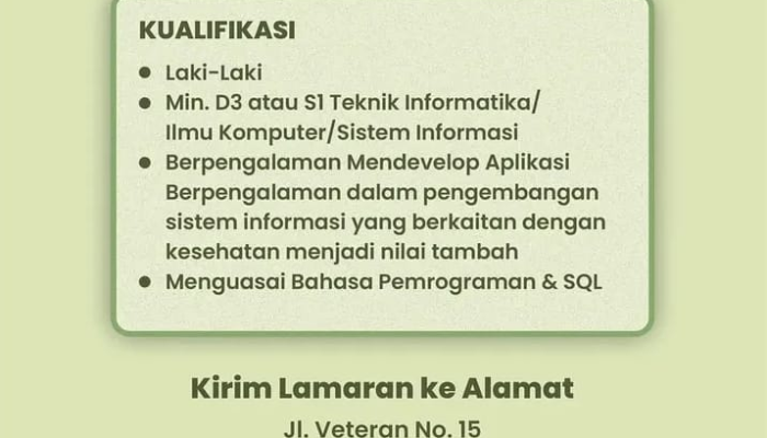 Kami mencari seorang IT Programmer yang kompeten dan bersemangat untuk mengembangkan serta memelihara sistem informasi yang menunjang pelayanan kesehatan kami. Jika Anda memiliki passion di bidang teknologi dan kesehatan, inilah kesempatan karir yang sangat menjanjikan.