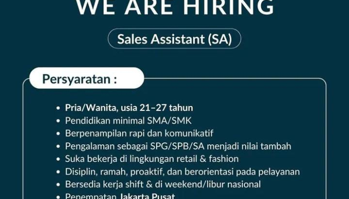Apakah Anda seorang individu yang dinamis, komunikatif, dan memiliki minat besar di dunia fashion? Magani, brand apparel inovatif dengan tagline “No Sweat No Limit”, sedang membuka kesempatan karir menarik bagi Anda untuk bergabung sebagai Sales Assistant (SA) untuk penempatan di wilayah Jakarta Pusat.