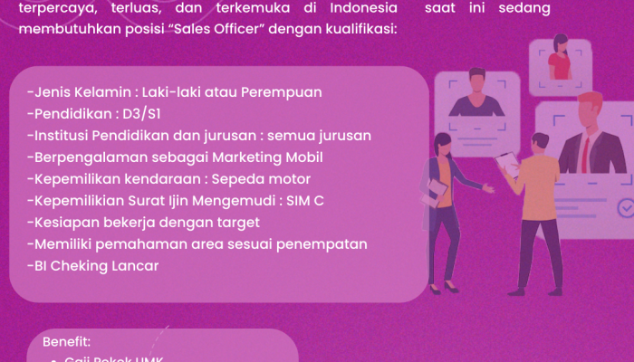 Untuk dapat melamar posisi Sales Officer ini, pastikan Anda memenuhi kualifikasi berikut: