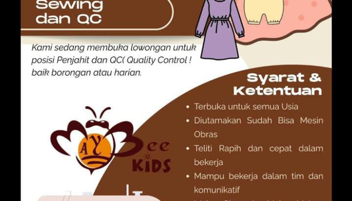 Apakah Anda memiliki keahlian dalam menjahit atau ketelitian tinggi dalam menjaga kualitas produk pakaian? Bee Kids, produsen pakaian anak yang sedang berkembang, saat ini membuka kesempatan karir bagi Anda untuk bergabung sebagai tenaga Sewing (Penjahit) dan QC (Quality Control) untuk penempatan di Kota Baru, Cikampek.