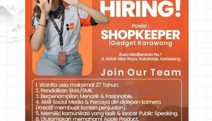 iGadget Store Karawang membuka kesempatan bagi kamu yang berjiwa muda, kreatif, dan percaya diri untuk bergabung sebagai Shopkeeper. Bekerja di lingkungan yang dinamis dan penuh semangat adalah impianmu? Yuk, gabung sekarang!