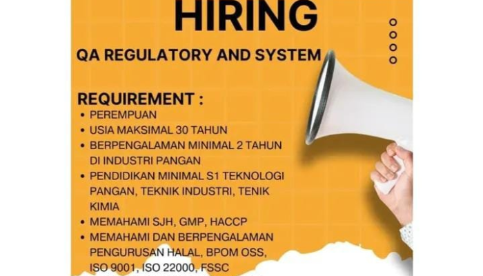 • Pendidikan: Minimal S1 Teknologi Pangan, Teknik Industri, atau Teknik Kimia.
