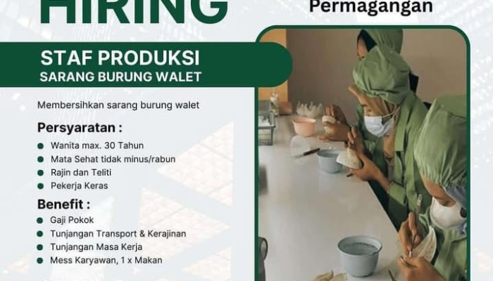 Apakah Anda seorang wanita yang teliti, rajin, dan pekerja keras? PT Vimayo Indonesia Persada membuka lowongan kerja untuk posisi Staf Produksi Sarang Burung Walet di Purwakarta, Jawa Barat. Posisi ini menawarkan gaji pokok dan berbagai tunjangan menarik, serta fasilitas penunjang yang lengkap.