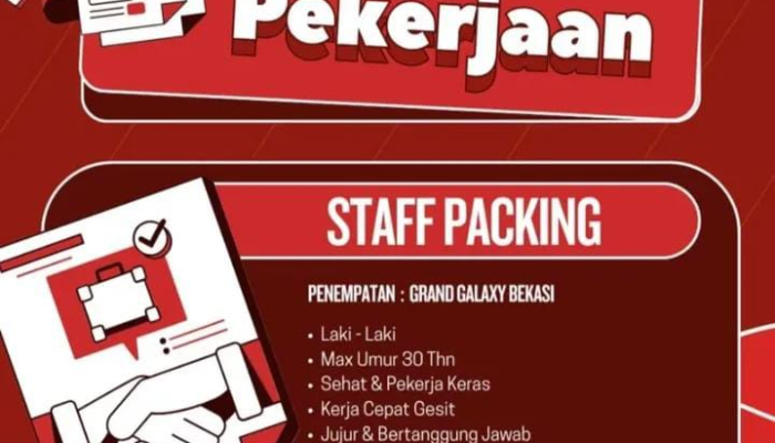 Apakah Anda seorang pria pekerja keras yang memiliki fisik kuat dan berdomisili di sekitar Bekasi? Vinstek Nikinter Nusa saat ini sedang membuka kesempatan bagi Anda untuk bergabung sebagai Staff Packing profesional untuk penempatan di area Grand Galaxy City. Jika Anda adalah pribadi yang jujur, cekatan, dan siap bekerja dalam tim yang dinamis, ini adalah kesempatan karir yang tepat untuk Anda. Segera kirimkan lamaran Anda dan mulailah berkarir bersama kami hari ini!