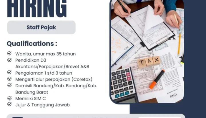 Kandidat harus memiliki pengalaman kerja 1 sampai 3 tahun, menguasai alur perpajakan (termasuk Coretax), dan diutamakan berdomisili di Bandung, Kabupaten Bandung, atau Kabupaten Bandung Barat. Segera kirimkan lamaran Anda!