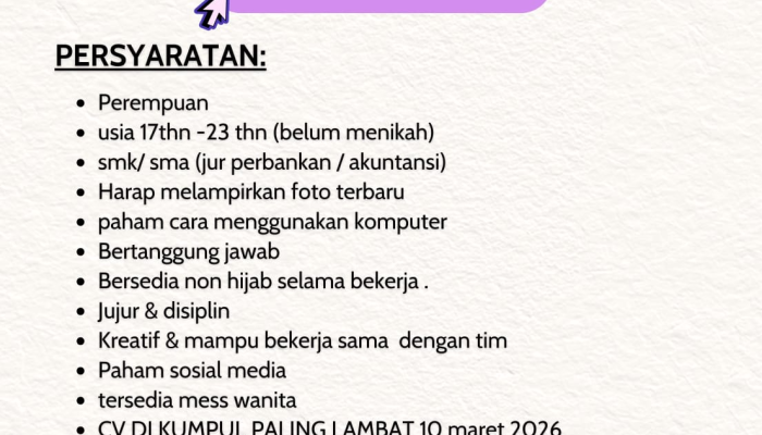- Pendidikan: Lulusan SMA/SMK (Diutamakan jurusan Perbankan atau Akuntansi).