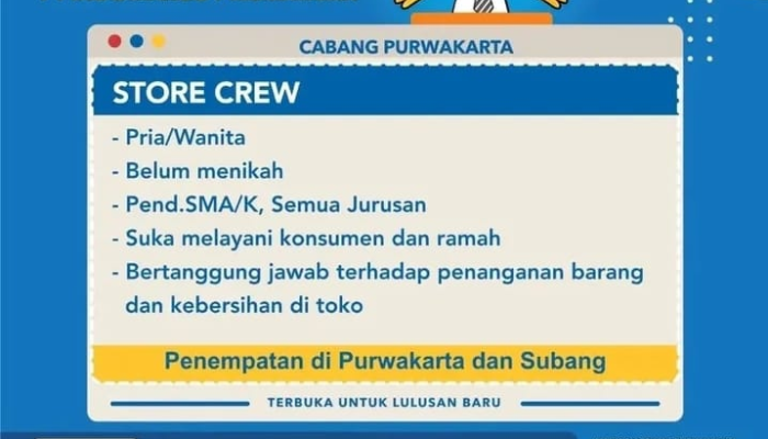 Ingin memulai karir di industri retail yang dinamis? PT Indomarco Prismatama, yang dikenal dengan Indomaret Group, membuka kesempatan emas bagi individu yang bersemangat untuk bergabung sebagai Store Crew. Jika Anda suka melayani konsumen, bertanggung jawab, dan siap ditempatkan di Purwakarta atau Subang, ini adalah peluang besar untuk Anda!