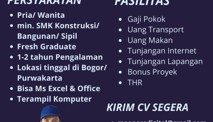 Apakah Anda memiliki latar belakang pendidikan di bidang konstruksi dan bersemangat untuk menjadi seorang Supervisor? Sebuah perusahaan konstruksi membuka lowongan untuk posisi Supervisor Konstruksi/Proyek. Jika Anda berdomisili di Bogor atau Purwakarta, ini adalah kesempatan emas untuk mendapatkan gaji pokok, tunjangan, hingga bonus proyek.
