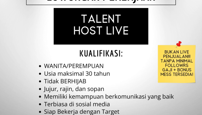 - Menjadi host atau talenta utama dalam sesi siaran langsung (live streaming) yang berfokus pada hiburan dan interaksi, bukan penjualan produk.