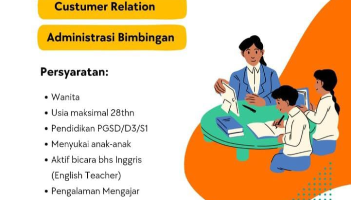 Apakah Anda seorang wanita yang suka mengajar, menyukai anak-anak, dan ingin berkarir di bidang pendidikan? Dibutuhkan segera tenaga profesional untuk posisi Pengajar Bahasa Inggris, Customer Relation, dan Administrasi Bimbingan. Jika Anda berdomisili di Bekasi dan siap bekerja dengan baik, ini adalah kesempatan yang tepat untuk Anda!
