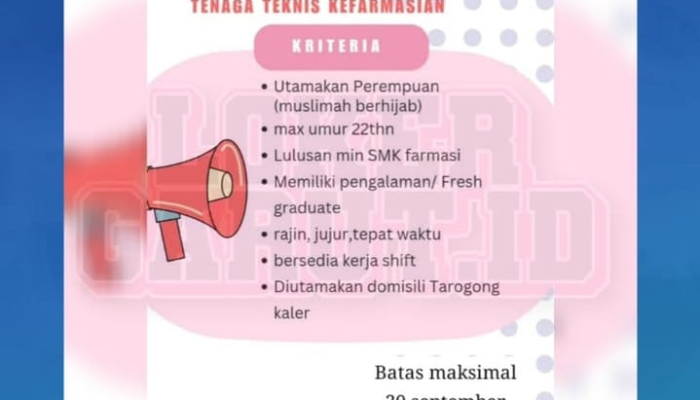 Apakah Anda seorang perempuan lulusan SMK Farmasi yang sedang mencari peluang kerja? Apotek Karisma membuka kesempatan emas bagi Anda yang berdedikasi, teliti, dan siap berkontribusi sebagai Tenaga Teknis Kefarmasian. Kami mencari individu yang jujur dan rajin untuk bergabung dengan tim kami di Tarogong Kaler, Garut. Ini adalah peluang yang tepat bagi Anda untuk memulai atau melanjutkan karir profesional di industri farmasi.