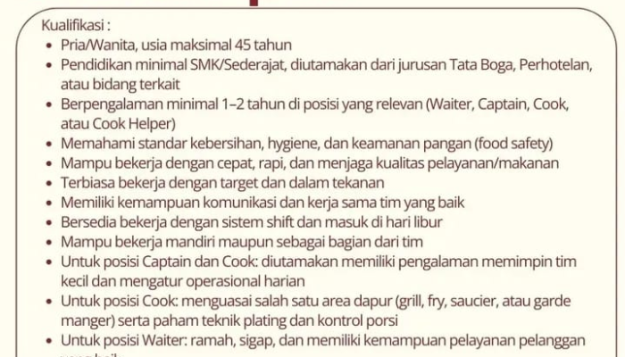 - Pendidikan minimal SMK/Sederajat (diutamakan Tata Boga, Perhotelan, atau bidang terkait)