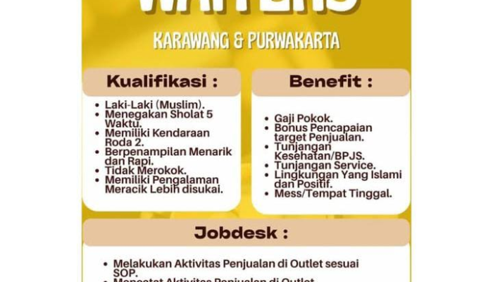 Apakah Anda seorang pria Muslim yang sedang mencari peluang karir di industri food & beverage? Es Mamang sedang membuka kesempatan emas bagi Anda untuk bergabung sebagai Waiters di area Karawang dan Purwakarta. Kami mencari individu yang berdedikasi, religius, dan memiliki semangat pelayanan tinggi untuk tumbuh bersama tim kami yang positif.
