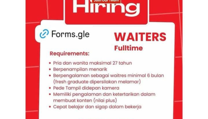 • Pengalaman: Diutamakan memiliki pengalaman sebagai waitress minimal 6 bulan, namun lulusan baru (fresh graduate) dipersilakan melamar.