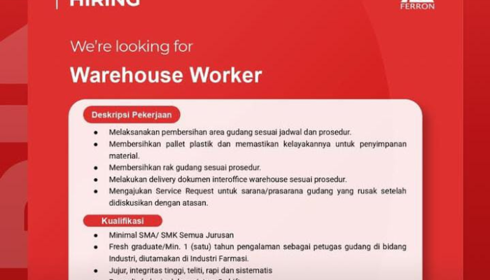 Sedang mencari kesempatan karir di bidang warehouse industri farmasi? PT Ferron Par Pharmaceuticals membuka peluang bagi kamu yang ingin berkembang dan siap bekerja dalam sistem shift. Lowongan sebagai Warehouse Worker ini sangat cocok untuk lulusan SMA/SMK maupun fresh graduate yang ingin memulai karier profesional di perusahaan farmasi besar.