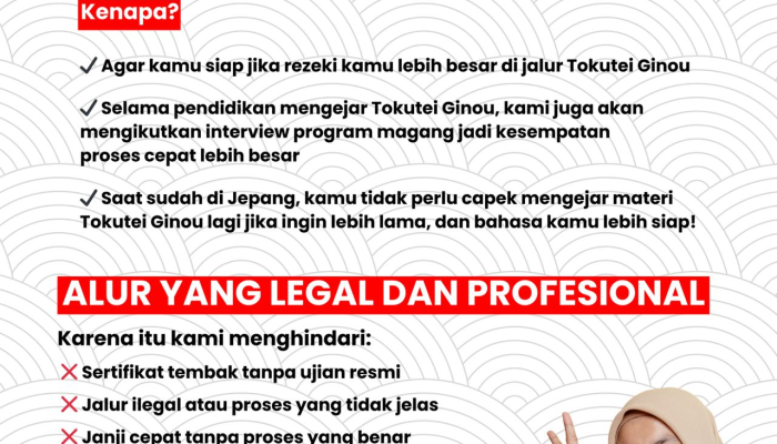 Apakah Anda memiliki impian besar untuk berkarier di Negeri Sakura namun merasa bingung dengan alur pendaftarannya? Banyak orang gagal mewujudkan impian ini karena tidak mengetahui jalur yang tepat atau terjebak dalam proses yang tidak jelas. LPK Nakama Japan hadir sebagai solusi profesional untuk membantu Anda meniti karier di Jepang melalui jalur yang legal, efisien, dan terstruktur. Di tahun 2026 ini, kami membuka kesempatan emas bagi Anda untuk memulai persiapan dengan cara yang paling mudah dan aman.