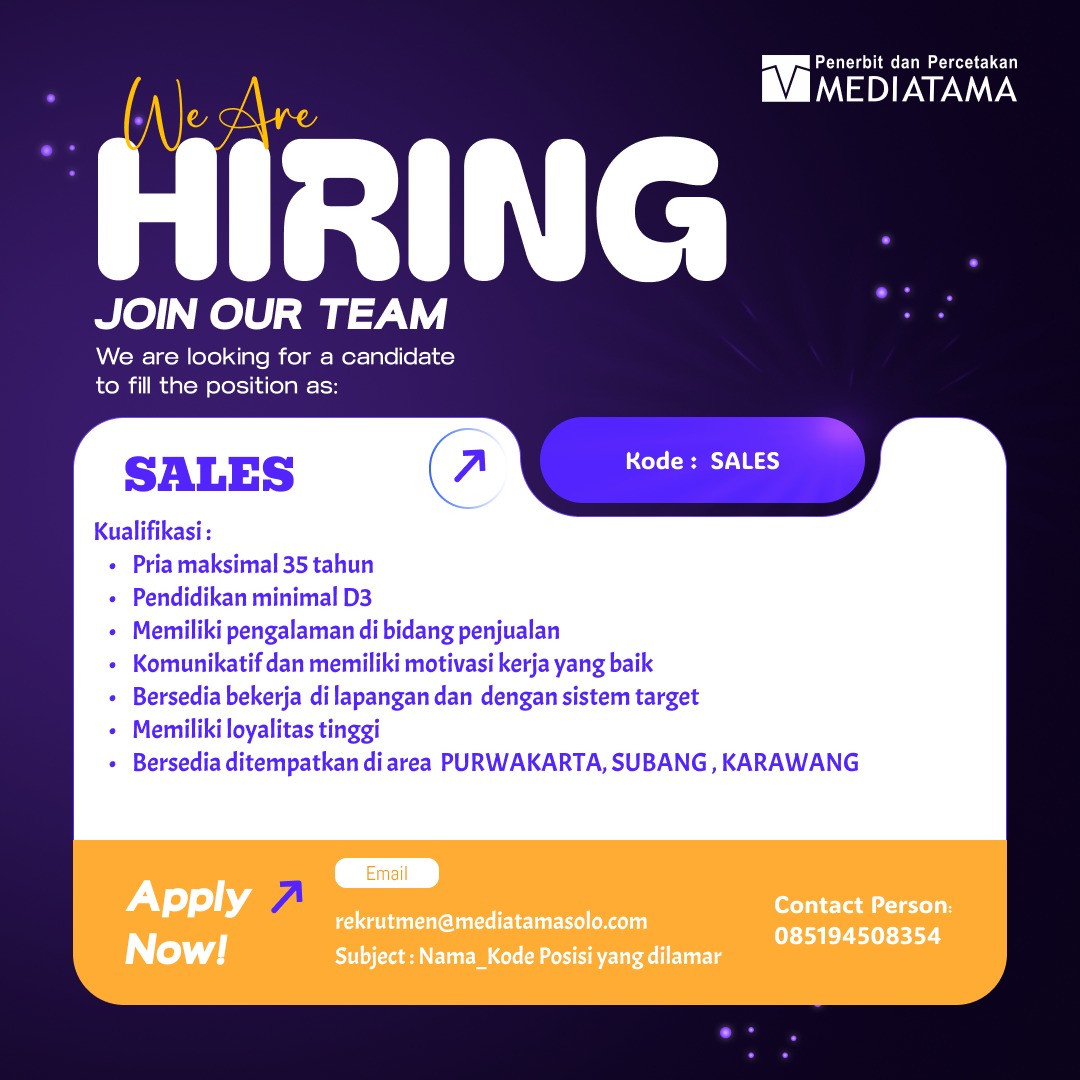 Jangan lewatkan kesempatan ini untuk membangun karir yang dinamis dan rewarding di bidang penjualan bersama Penerbit dan Percetakan Mediatama!