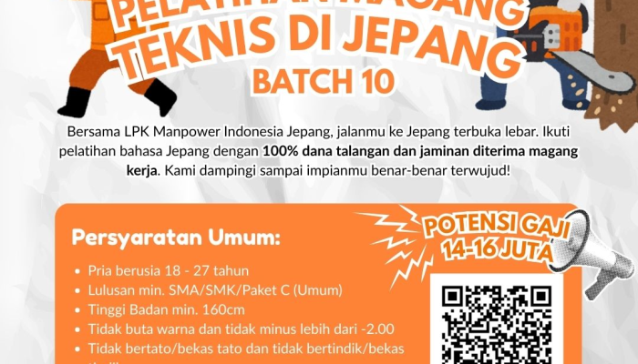 Apakah Anda bermimpi untuk berkarir dan mendapatkan pengalaman kerja internasional di Jepang? LPK Manpower Indonesia Jepang kembali membuka kesempatan emas melalui Open Recruitment Pelatihan Magang Teknis di Jepang Batch 10. Dengan jaminan diterima magang kerja dan dukungan dana talangan 100%, jalan Anda menuju Negeri Sakura kini terbuka lebar.