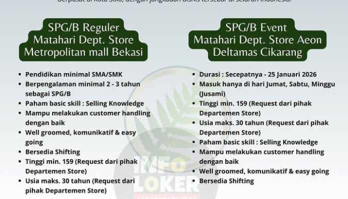 Khusus untuk posisi SPG/B Event, penempatan berlaku hingga 25 Januari 2026. Untuk posisi reguler, segera kirimkan lamaran Anda sebelum kuota terpenuhi.